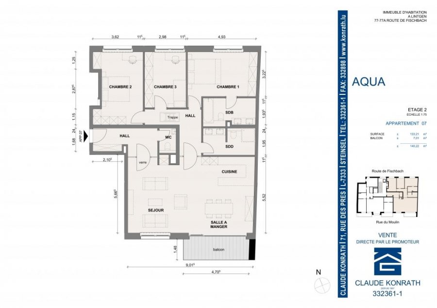 Appartement 07 d'une surface de 133.08 m2 + balcon de 7.01m2 comprenant: